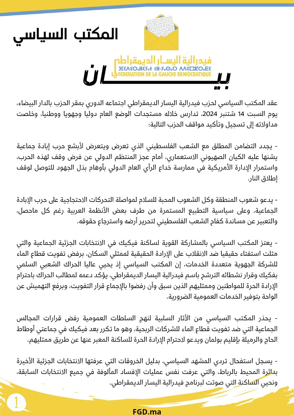 عقد المكتب السياسي لحزب فيدرالية اليسار الديمقراطي اجتماعه الدوري بمقر الحزب بالدار البيضاء، يوم السبت 14 شتنبر 2024، تدارس خلاله مستجدات الوضع العام دوليا وجهويا ووطنيا، وخلصت مداولاته إلى تسجيل وتأكيد مواقف الحزب التالية: